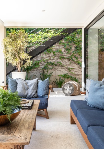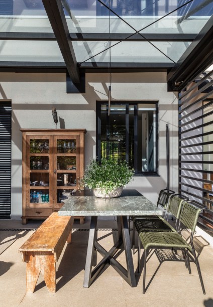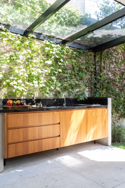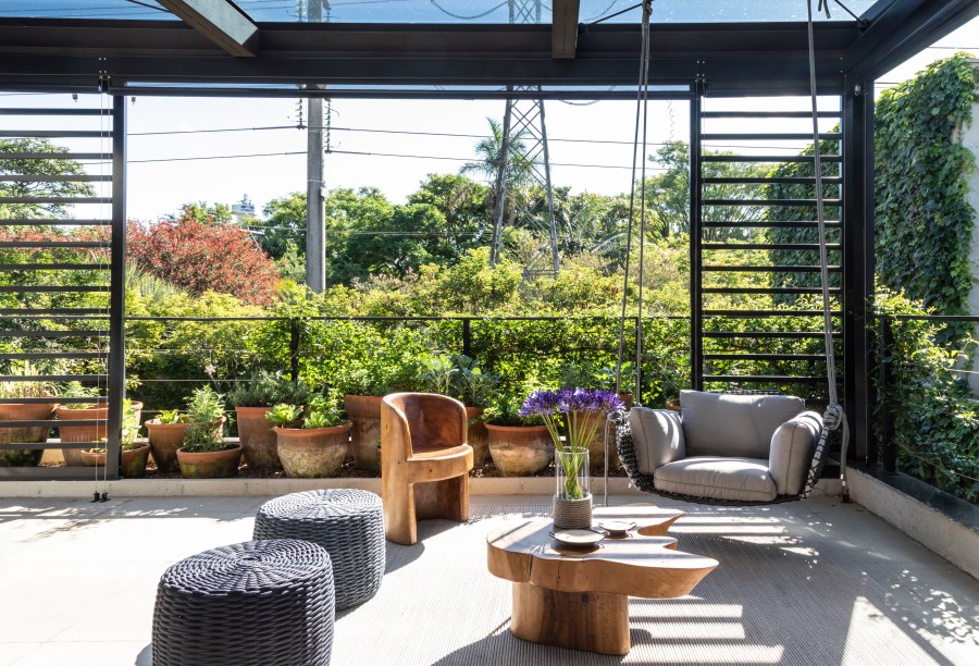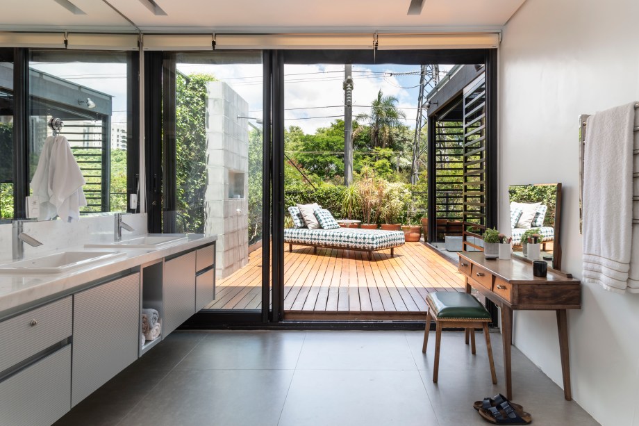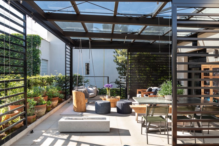 Sendo assim, a planta da casa sofreu algumas alterações. O terraço privativo da suíte, por exemplo, que antes era subutilizado, recebeu uma estrutura metálica preta com teto de vidro transparente, ambiente de estar, balanço, mesa para refeições, lareira, um deck de madeira com chaise longue e chuveirão, conectado ao banheiro.