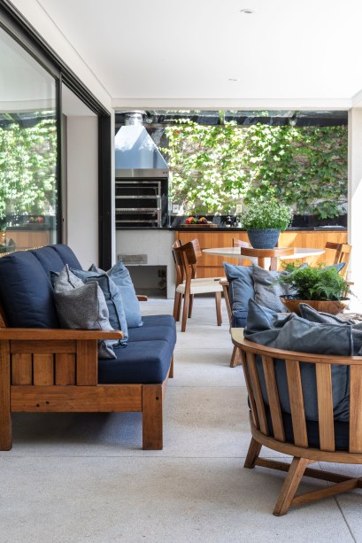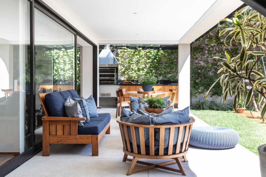Já a varanda coberta do piso térreo, de frente para a piscina e ao lado da churrasqueira, é destinada ao convívio familiar e para receber os amigos das filhas.