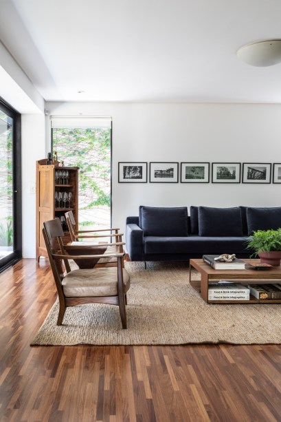 Entre as peças novas, estão o sofá de veludo azul marinho, a mesa de centro de Silvio Romero, as cadeiras de jantar e o tapete.