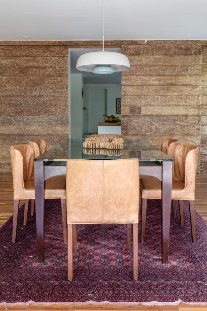 Nas salas de estar e jantar, entre as peças de acervo que foram reaproveitadas, Carolina destaca a cristaleira pequena, o par de poltronas, a poltrona com banqueta, a mesa de jantar e, sob ela, o tapete persa.
