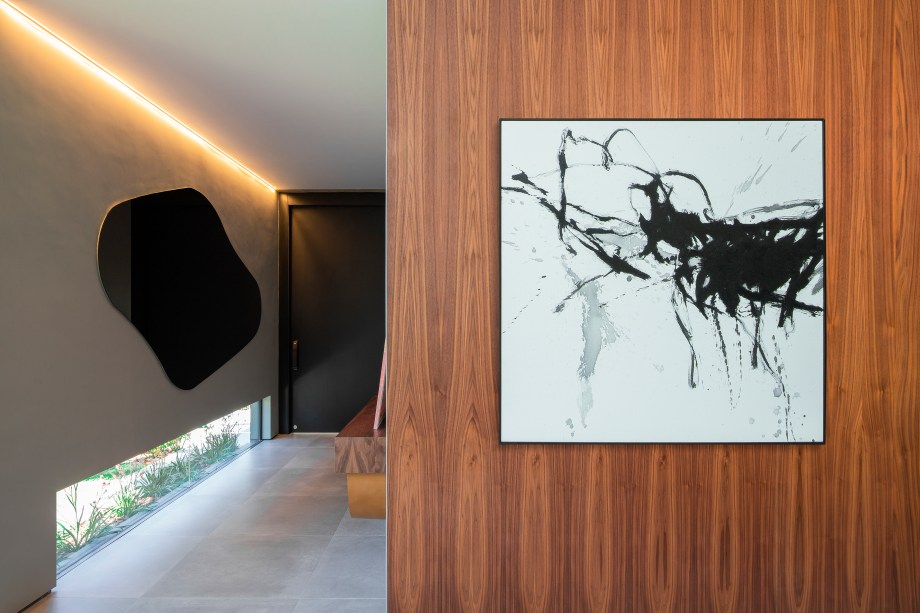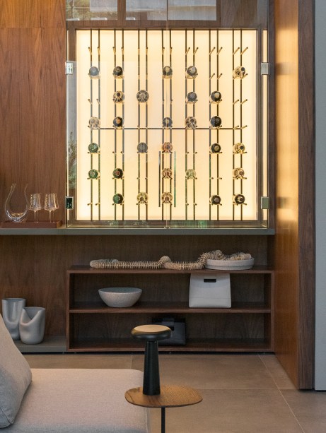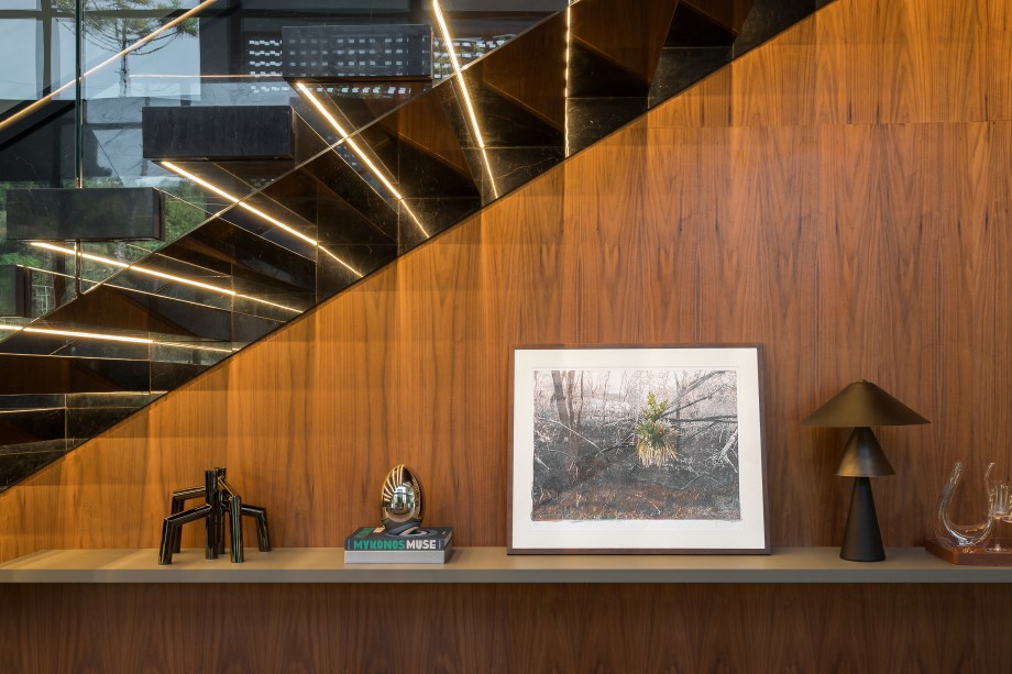 A Poltrona Moleca, do Sérgio Rodrigues, a adega com iluminação, a escada vazada revestida em mármore Nero e as obras de arte de Zilda Fraletti, Zimmerman, Marcelo Conrado e Juliane Fuganti trazem personalidade e expressão artística para a decoração.