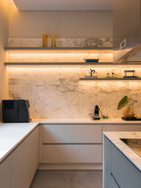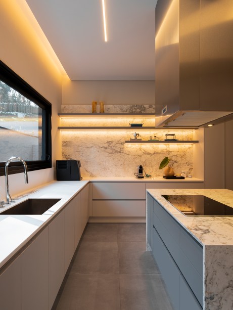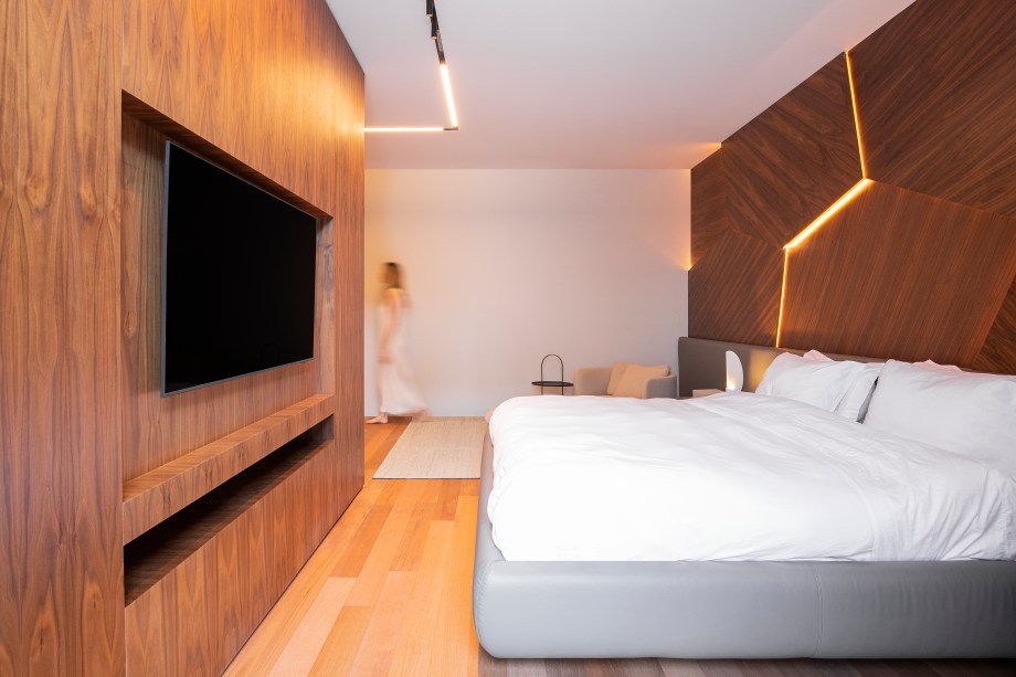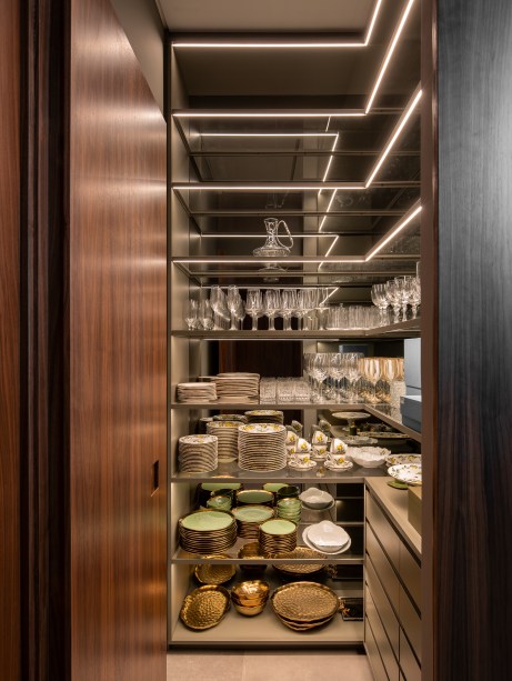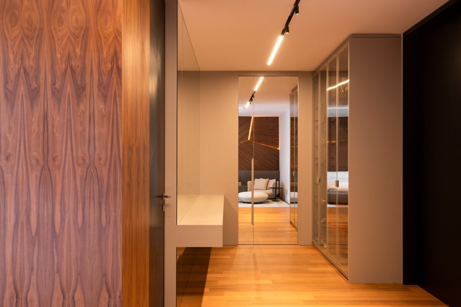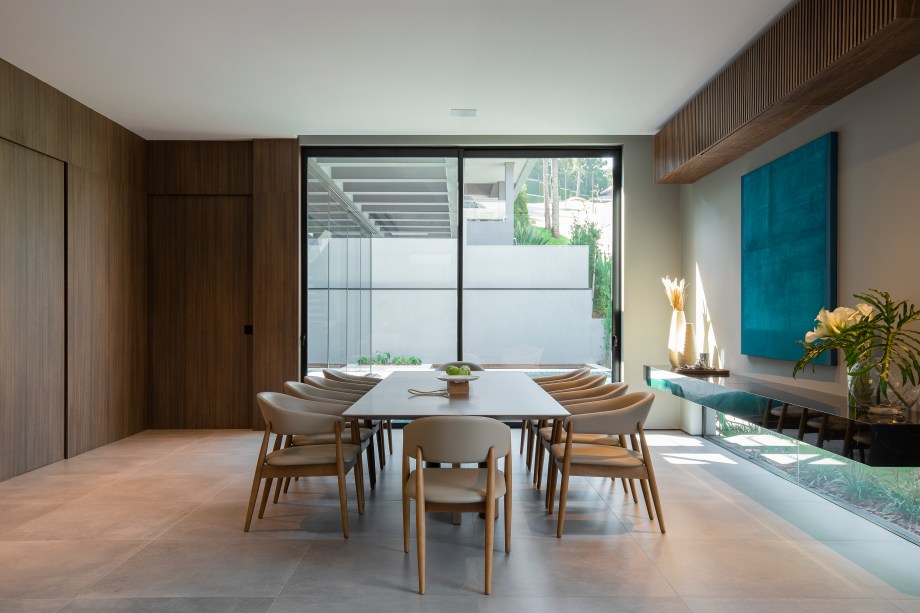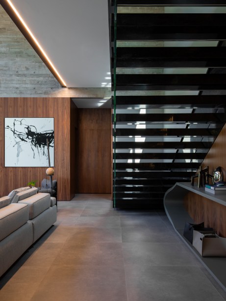 “A escolha da madeira em lâmina de nogueira trouxe uma sensação de calor e elegância para a residência, enquanto o uso do mármore negro na escada e a pedra no lavabo acrescentam um visual marcante e luxuoso”, contou Gabriela.