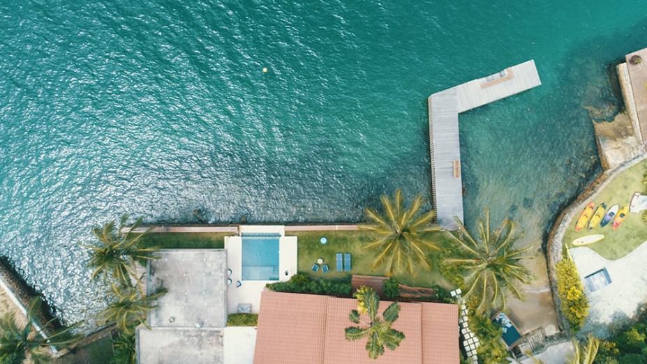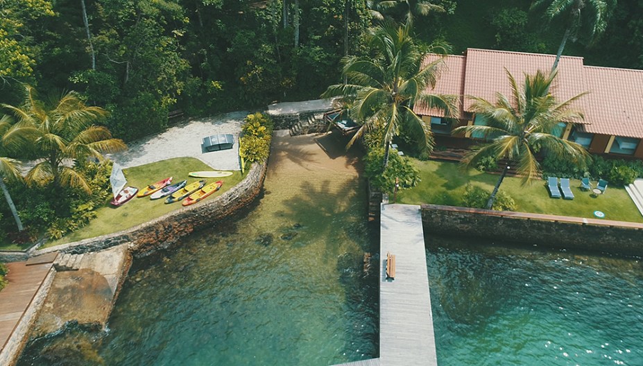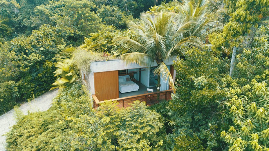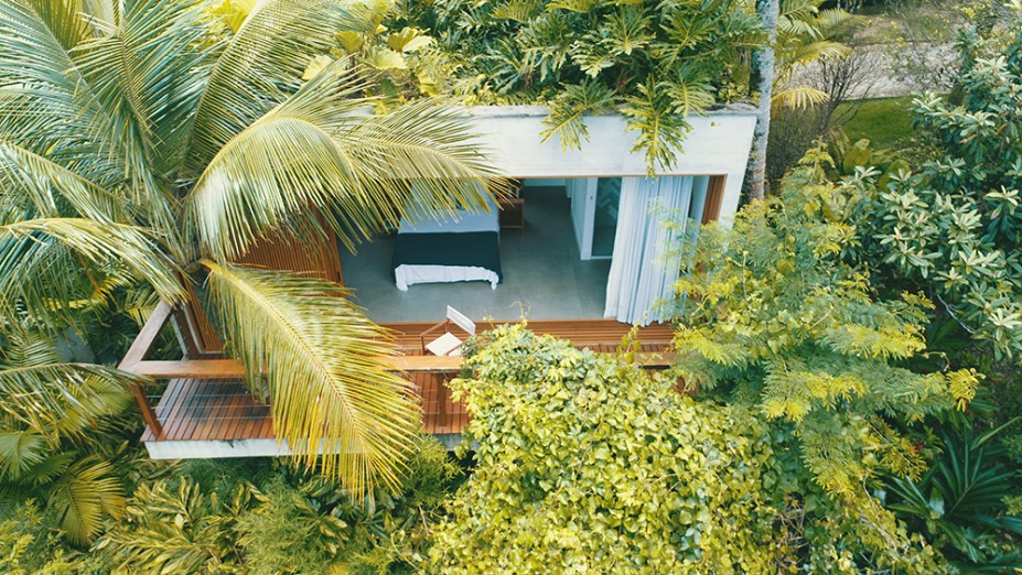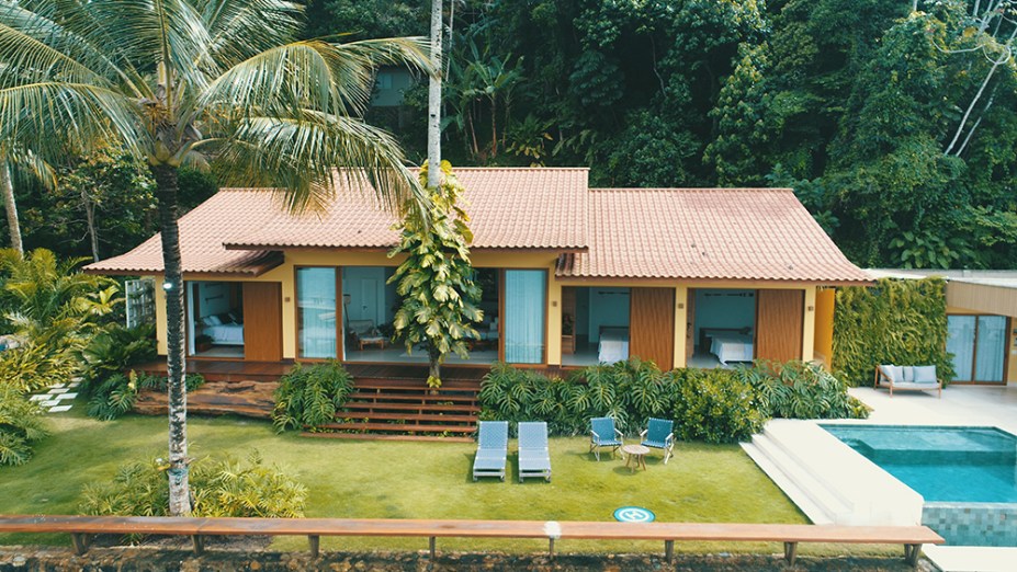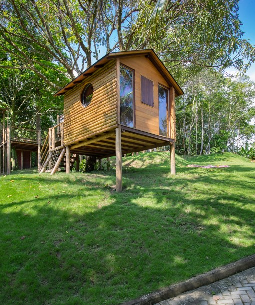 No alto do terreno, logo na entrada, fica a área de recreação, com casa na árvore e arvorismo, seguida do estacionamento. Descendo em direção ao mar ficam espalhados os bangalôs e a casa principal, com área gourmet e piscina, todos voltados para o mar.