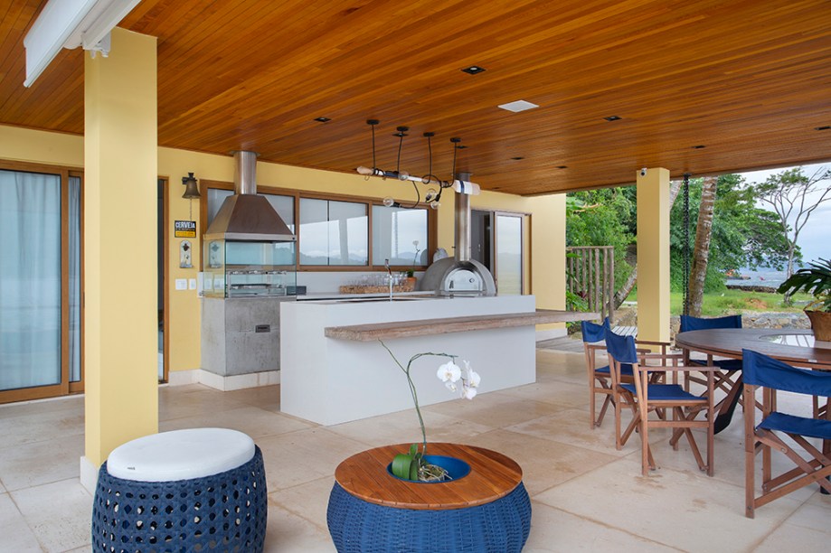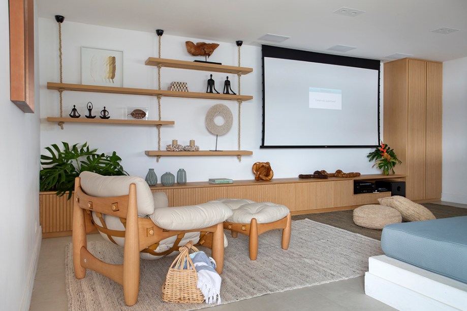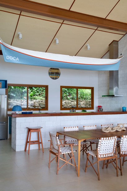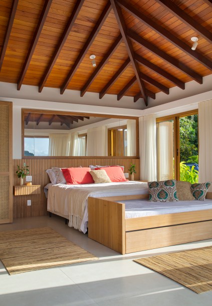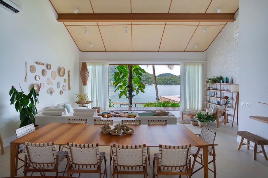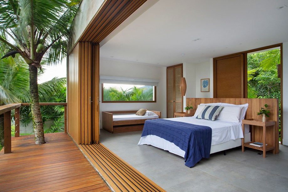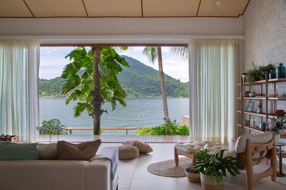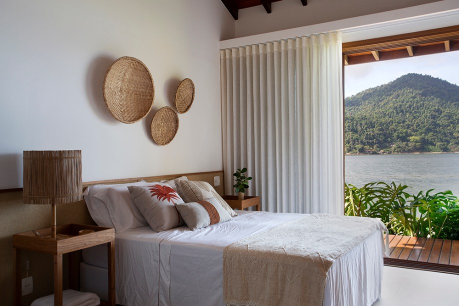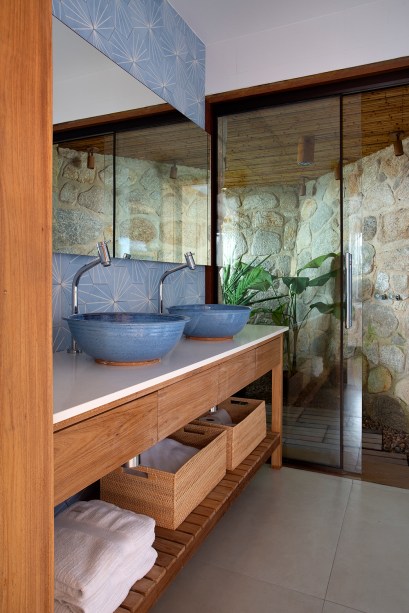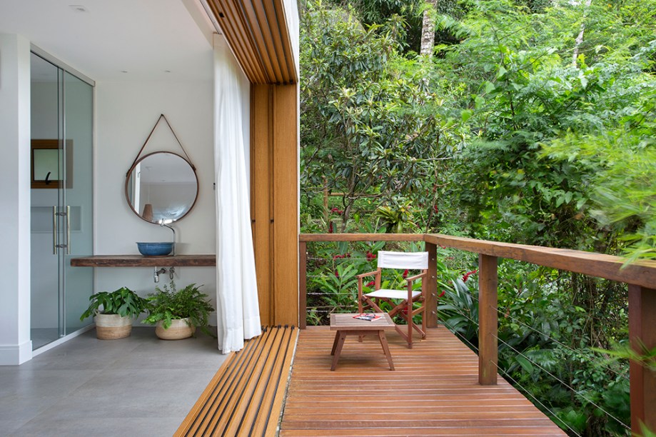 Para isso, além de criar espaços abertos para o exterior, a arquiteta recorreu a elementos naturais, como madeira, palha e pedras, para aumentar a sensação de conexão dos moradores com a natureza, mesmo dentro de casa. Todos os armários receberam soluções para ventilação interna, em palha ou madeira veneziana, uma vez que o local é muito úmido e a casa precisava ser prática e funcional.