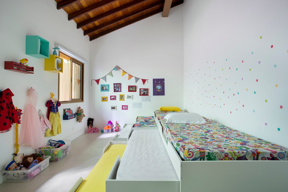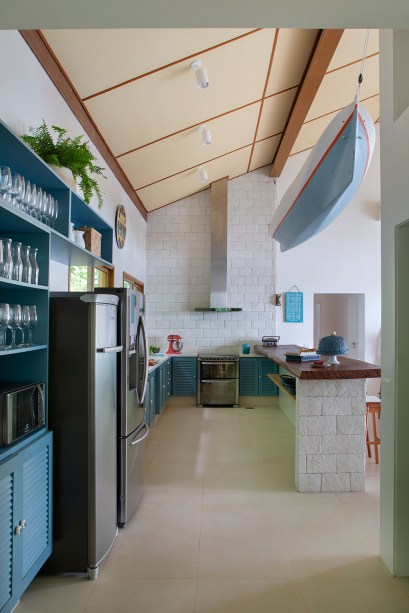Na paleta de cores, branco, azul e coral são as cores principais que se misturam aos tons amadeirados do freijó, presentes sobretudo nos móveis e no forro do telhado. A moradora queria uma casa muito clara.