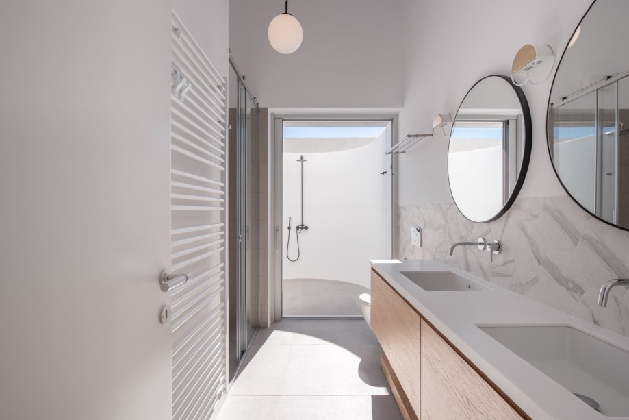 A construção de 200 m² fica em um enorme terreno, de mais de 4 mil m², com vista para a montanha de Parnassos de um lado, e para o mar, do outro. Dessa forma, quase não se vê nenhum vizinho no entorno, criando uma experiência de refúgio aos moradores.