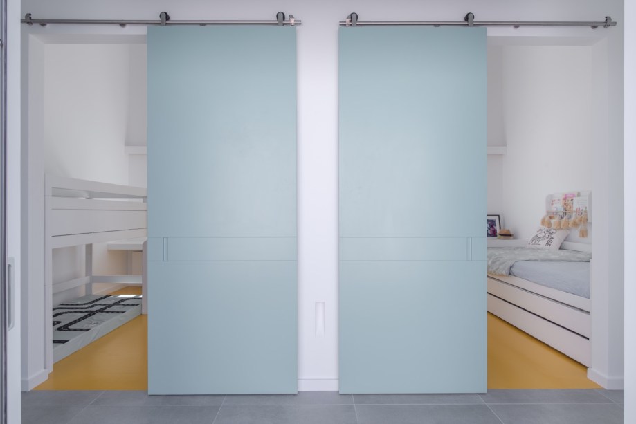 Apesar de ter grandes vãos e aberturas para a paisagem externa, a casa também garante privacidade aos moradores. A área central, demarcada por uma porta amarela, leva à duas alas separadas: um com dois quartos e outra com o quarto de hóspedes. O encontro entre essas duas alas é um espaço generoso, onde foi instalada a cozinha gourmet, a sala de jantar e a de estar. Para garantir iluminação natural, os arquitetos desenharam duas claraboias: uma sobre a bancada da cozinha e outra sobre a mesa de jantar.