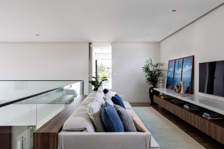O terreno espaçoso em um condomínio no Guarujá, litoral de São Paulo, permitiu aos arquitetos dos escritórios Rua 141 e Zalc Arquitetura a criarem uma casa de praia bem ampla e aconchegante, com 525 m². A principal característica da arquitetura é o projeto estrutural marcado pelo jogo de volumes com balanços, que aproveita ao máximo a iluminação natural, a ventilação cruzada, além de trazer a natureza para os espaços internos.