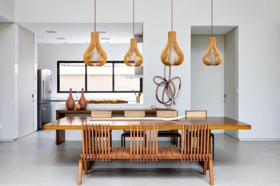 Na sala de jantar, a mesa de madeira e o pendente de fibra natural reforçam essa ideia de rusticidade, sem abrir mão da elegância. Repare que as cadeiras são de modelos diferentes de cada lado da mesa.