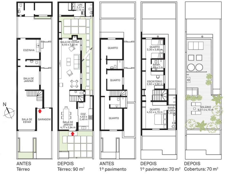 Morar perto do trabalho, numa região cheia de árvores e valorizada pelo mercado imobiliário, era prioridade para o arquiteto paulistano Gil Mello e sua mulher. Por isso, eles decidiram comprar e reformar este sobrado no bairro Alto de Pinheiros, em São Paulo. “Do projeto original, além da implantação, que preservava os recuos exigidos por lei, restaram apenas as lajes, alguns ladrilhos e parte dos tijolos maciços”, diz Gil. Para conquistar luminosidade e aproveitar melhor os 160 m², ele abriu as fachadas com vidro e ergueu a cozinha no lugar da antiga garagem. No térreo, a sala de estar ficou voltada para os fundos do terreno. Dois quartos e um escritório redesenharam o andar superior. “Como muitas paredes foram retiradas, reforçamos as estruturas com vigas metálicas”, explica. Isso estava previsto. Já a substituição do telhado por uma laje plana onde fica um solário foi de última hora. “Achávamos que esse custo não valeria a pena. Hoje, a cobertura é nossa praia particular”, conta.