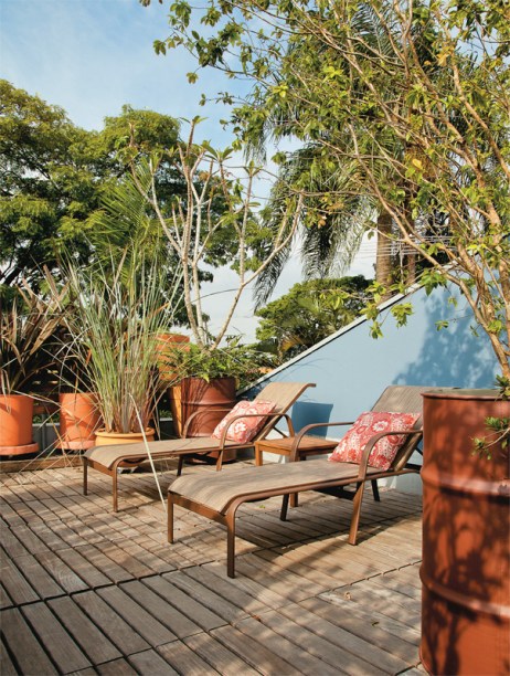 Morar perto do trabalho, numa região cheia de árvores e valorizada pelo mercado imobiliário, era prioridade para o arquiteto paulistano Gil Mello e sua mulher. Por isso, eles decidiram comprar e reformar este sobrado no bairro Alto de Pinheiros, em São Paulo. “Do projeto original, além da implantação, que preservava os recuos exigidos por lei, restaram apenas as lajes, alguns ladrilhos e parte dos tijolos maciços”, diz Gil. Para conquistar luminosidade e aproveitar melhor os 160 m², ele abriu as fachadas com vidro e ergueu a cozinha no lugar da antiga garagem. No térreo, a sala de estar ficou voltada para os fundos do terreno. Dois quartos e um escritório redesenharam o andar superior. “Como muitas paredes foram retiradas, reforçamos as estruturas com vigas metálicas”, explica. Isso estava previsto. Já a substituição do telhado por uma laje plana onde fica um solário foi de última hora. “Achávamos que esse custo não valeria a pena. Hoje, a cobertura é nossa praia particular”, conta.
