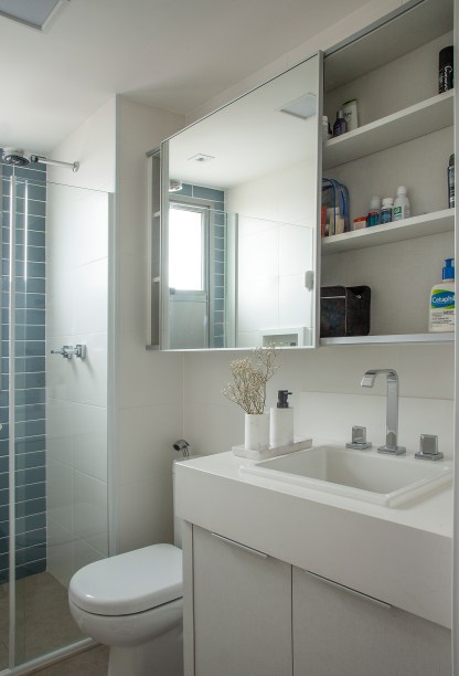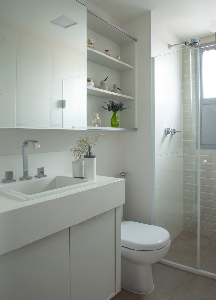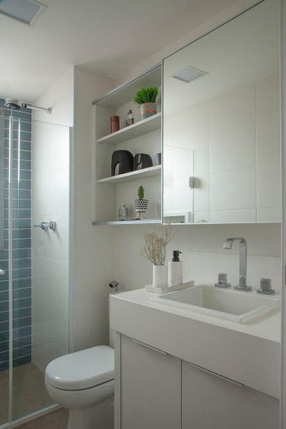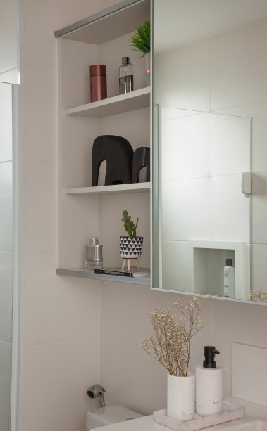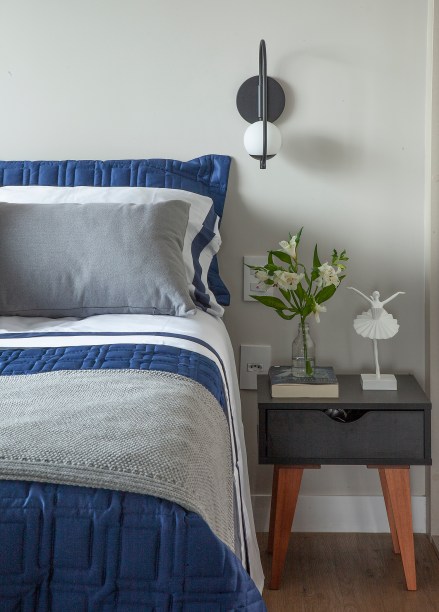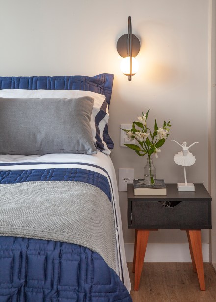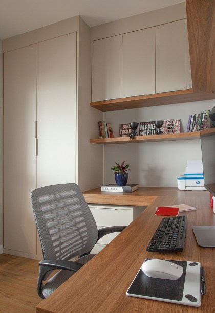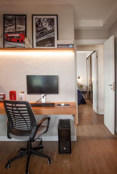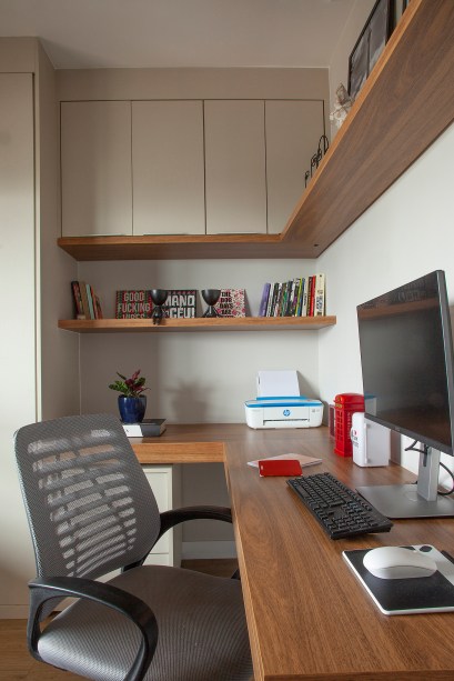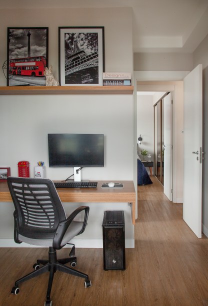 Na área íntima, o destaque fica para o home office, que foi projetado para ser facilmente adaptado para um quarto de bebê, quando a família crescer. A bancada conta com espaço para dois computadores e boa iluminação, garantindo conforto para as horas de trabalho. “A suíte máster é aconchegante e conta com uma parede de armários bem espaçosos”, afirmam as arquitetas.