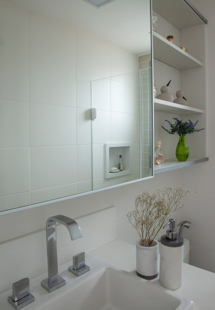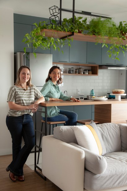 “Usamos cores pontuais e harmoniosas em todos os ambientes, sem carregar visualmente, permitindo um décor harmônico entre estar, varanda e cozinha”, dizem as profissionais. A fim de aproveitar bem o espaço, a dupla projetou uma chapelaria em marcenaria, que também abriga o cantinho do bar.