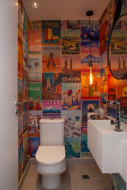 Cheio de personalidade, o lavabo do apartamento também traduz a essência do casal, trazendo em sua parede um lambe-lambe com imagens de países que os moradores já conheceram ou sonham em visitar.