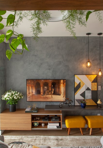 Cimento queimado, madeira e plantinhas: veja o projeto deste apê de 78 m²