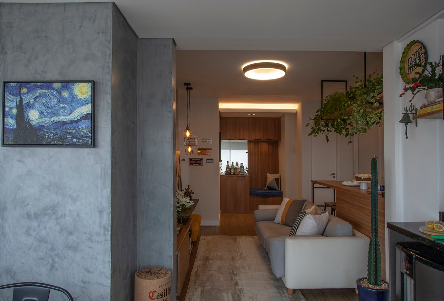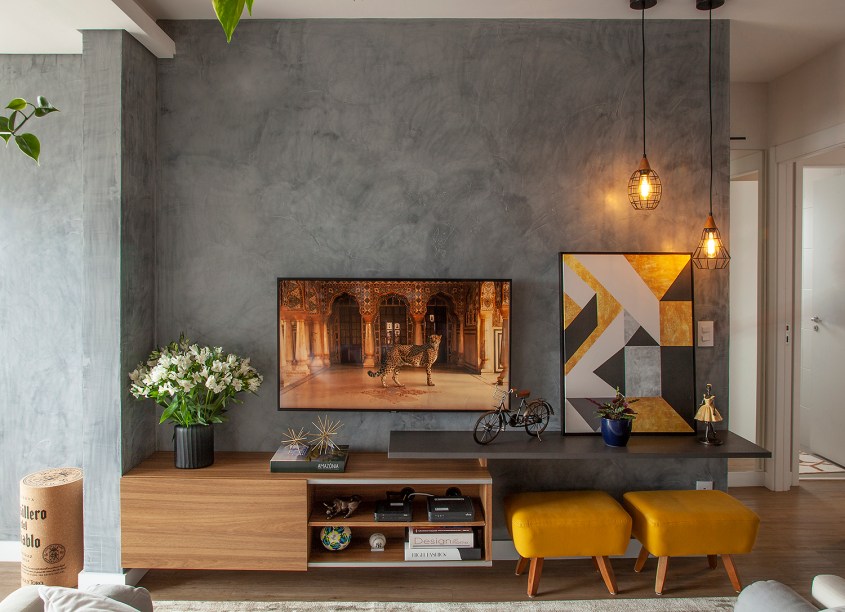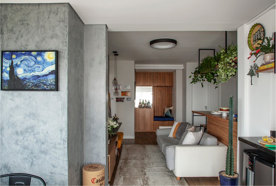 Integrada à varanda, a sala de estar ganhou uma parede de cimento queimado, deixando para os detalhes as pinceladas de cor – como nas obras de arte (Online Quadros), objetos decorativos (Lili Wood) ou mobiliário solto.