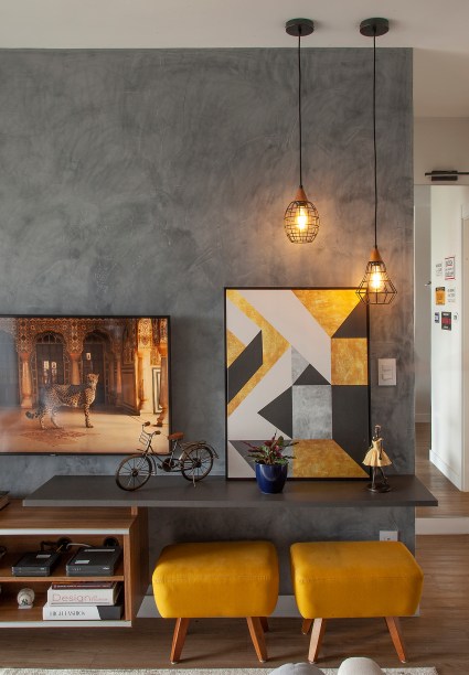 “Além de impactante, foi a escolha perfeita para harmonizar com a parede de cimento queimado e com os tons claros do apartamento”, sinalizam Bianca e Viviane.
