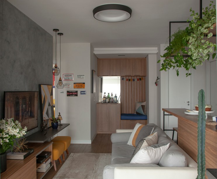 Para delimitar o espaço, a bancada foi essencial – além de servir como apoio para os preparos, conta com duas banquetas que permitem que seja usado também para refeições rápidas. Suspensa, uma prateleira com estrutura metálica ganhou diversas plantas, para conferir o frescor necessário ao apartamento.