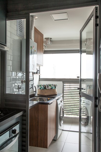 Bancada de lâmina sintetizada integra cozinha e área gourmet neste apartamento