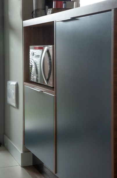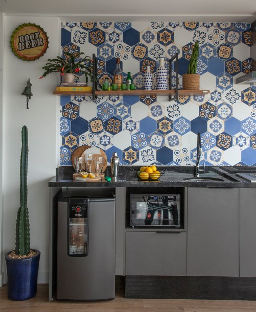 Com conceito aberto, a cozinha, por sua vez, ganhou uma marcenaria planejada que fosse capaz de organizar todos os itens necessários. Os armários contam com acabamento em pintura de tom azul, a cor preferida do casal.