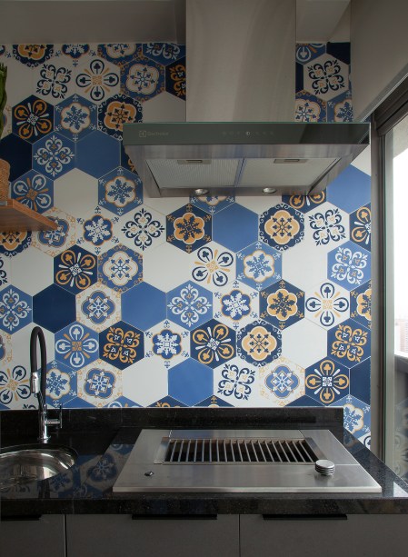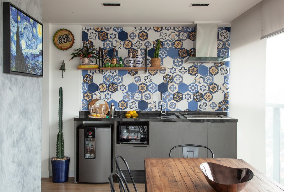 Para receber uma boa bancada de apoio para a churrasqueira, as arquitetas fecharam uma passagem que levava à área de serviço, ganhando uma parede na varanda que foi toda revestida com cerâmica hidráulica hexagonal. Também é nesse ambiente que se encontra uma extensa mesa de jantar de madeira rústica, deslocada para lá a fim de deixar o living mais livre.