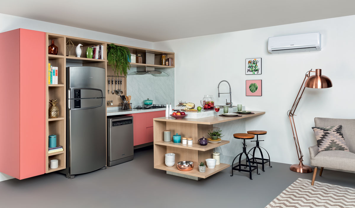 A marcenaria colorida traz um tom de rosa sofisticado e, ao mesmo tempo, descontraído, o que dá muita bossa ao ambiente. As bancadas de madeira clara e o porcelanato que imita mármore completam a leveza que as arquitetas buscaram e mantêm o espaço sempre com um ar de frescor. “O porcelanato carrara facilita muito a limpeza, já que não é poroso como o mármore. Isso evita manchas de bebidas como café ou vinho”, explica Daniele. Além disso, a solução garante um visual de grande impacto sem pesar no orçamento da reforma.