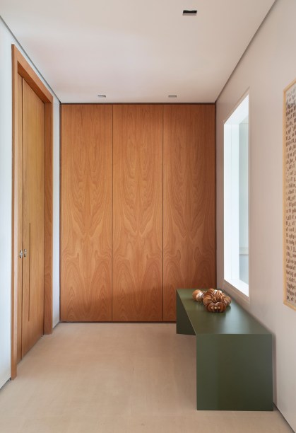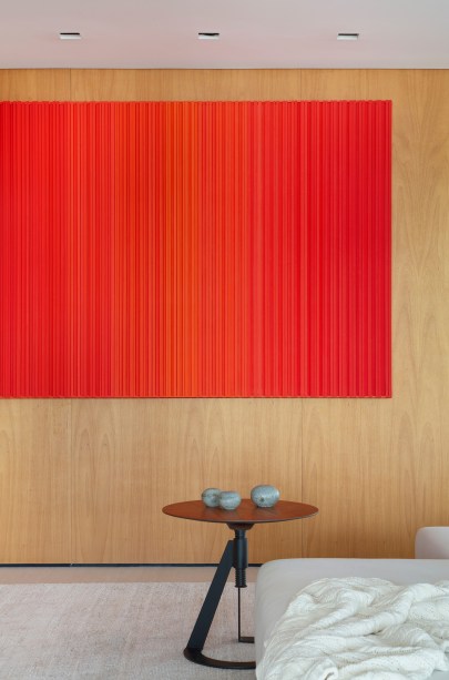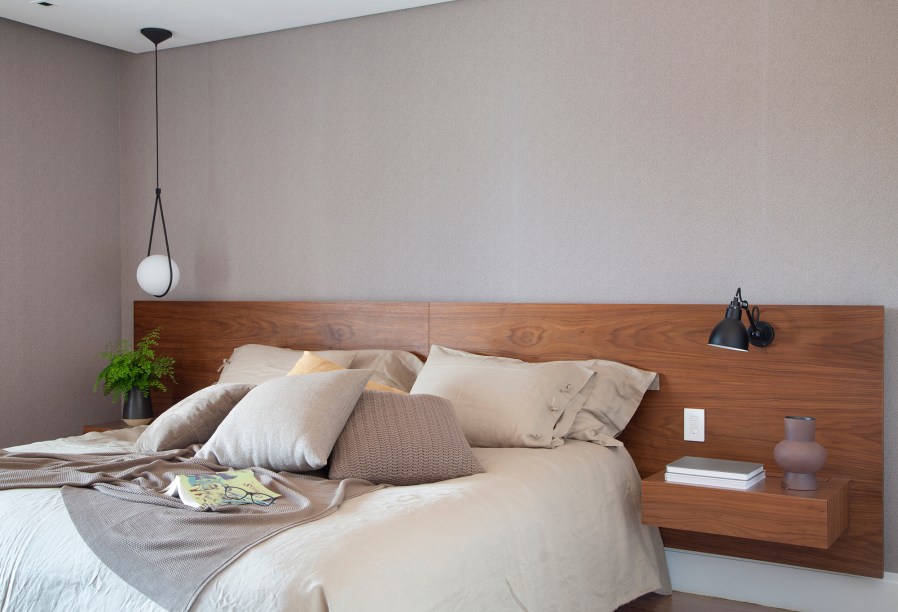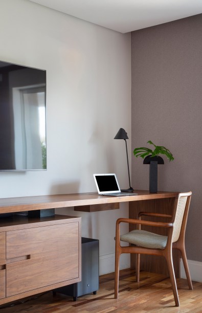 No dormitório do casal, há também um espaço de home office. Seguindo a linha de mobiliário baixo e minimalista do apartamento, a arquiteta desenhou a cama e as mesas de cabeceira soltas do piso para dar leveza ao ambiente.
