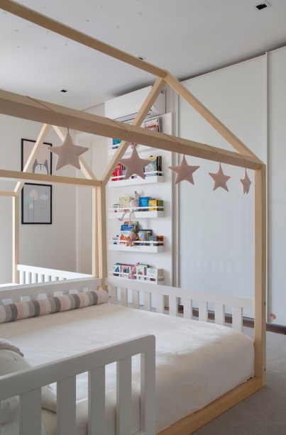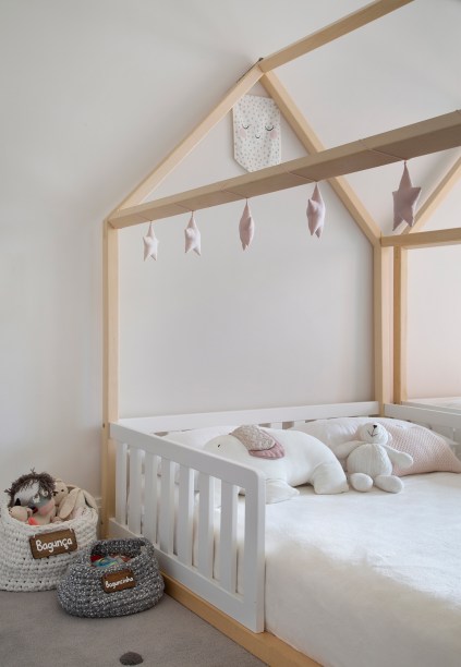 Para o quarto das filhas, a escolha foi por tons pastel e mobiliário montessoriano, que já existia na antiga moradia dos proprietários, também projetada pelo escritório.