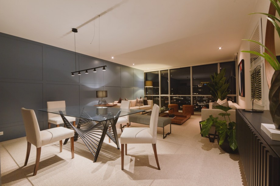 A sala de estar, sala de jantar e quartos foram trabalhados pelo Paralelo Estudio para que os donos do imóvel recebessem dois sócios estrangeiros. “Foi uma reforma rápida, visto que o principal requisito do cliente era que em 15 dias o apartamento estivesse pronto. Começamos a trabalhar o projeto com rapidez e depois com a obra no local”, conta o estúdio.