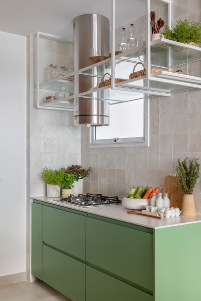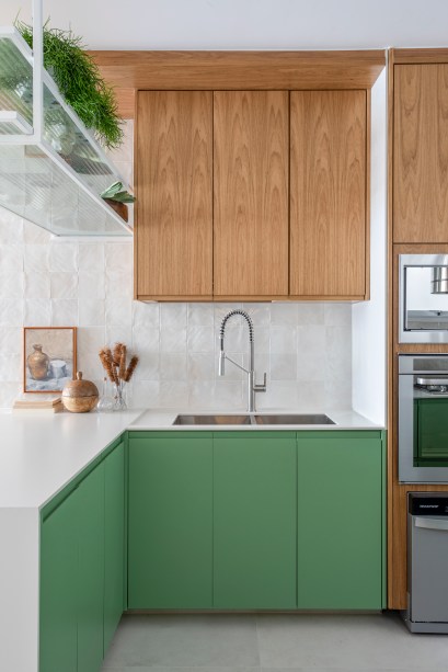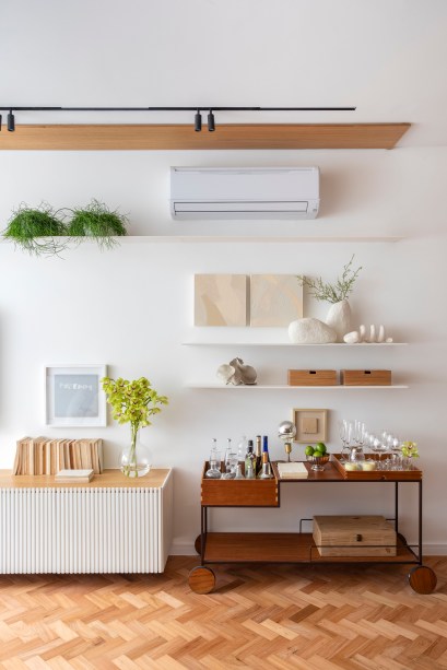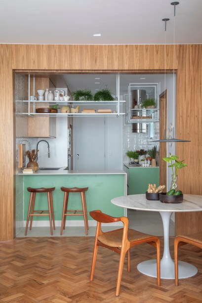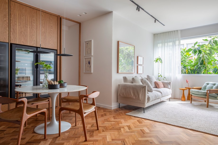 “Partimos do piso em taco de madeira natural, que é original do imóvel e clareamos na restauração, para definir a paleta de cores da decoração da sala, composta, além dos móveis soltos, por marcenarias com acabamento em freijó catedral, laca branca ou cinza”, diz ele. Já os armários da cozinha integrada à sala ganharam acabamento em laca num tom verde suave, acrescentando cor sem pesar visualmente no espaço.