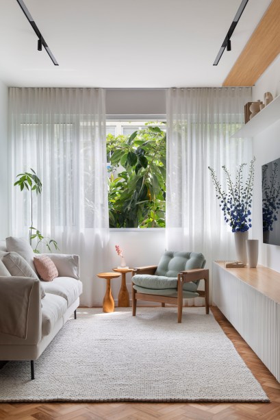 O escritório Rafael Ramos Arquitetura apostou nos móveis soltos e materiais e cores claras para criar uma atmosfera aconchegante e leve