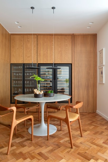 Nas salas de jantar e estar com tv, o arquiteto destaca ainda a marcenaria projetada para embutir, de um lado, uma adega dos sonhos e, do outro, uma cristaleira. Outro destaque é o rack suspenso em laca cinza com acabamento ripado frontal e lateral, o bar Dama (assinado por Fernando Jaeger) e a poltrona Renata (assinada por Sérgio Rodrigues).