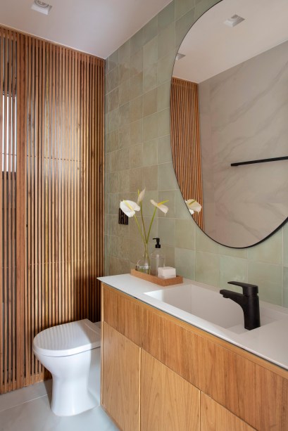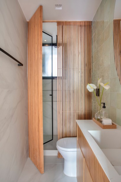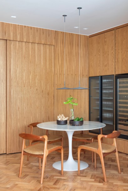 Entre as principais modificações na planta do imóvel, no lugar da antiga dependência de serviços foram criados um banheiro e um closet no dormitório do casal, que virou uma suíte completa. O antigo banheiro social ganhou ares de lavabo através de um painel ripado que camufla o box. Já a cozinha foi integrada à sala de jantar e, no lugar da parede demolida, foi instalado um painel de madeira com portas de correr que permitem isolar os espaços, quando necessário.