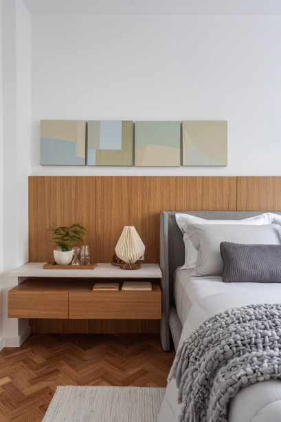 Detalhes em laca dão destaque à marcenaria de apê de 110m² com décor leve