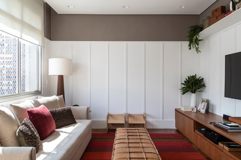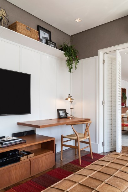 O Ana Veirano Studio, responsável pelo projeto, transformou um dos ambientes de estar com sala de TV, escritório e quarto de hóspedes. Por contar com venezianas (pin soleil), o espaço pode estar ou não integrado ao living.