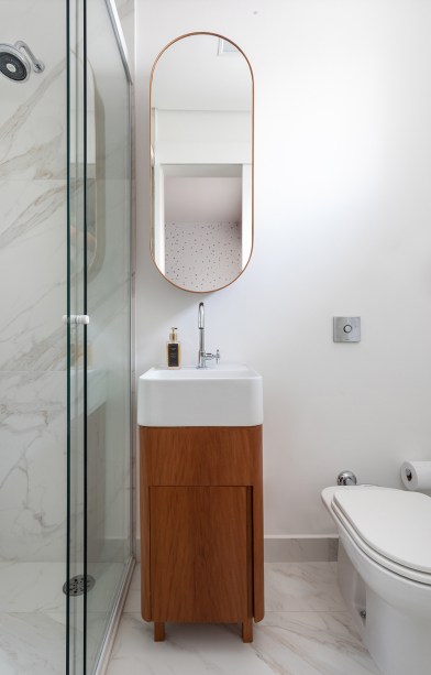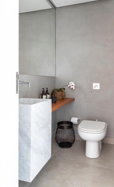 A fim de que a porta de entrada não ficasse dentro da sala, Ana optou por jogá-la para a lateral. Outra mudança na planta original foi a criação de um lavabo a partir de um dos banheiros do quarto, que era muito grande e foi dividido, abrindo para a sala.