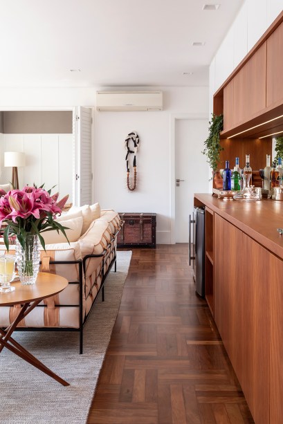 Para o décor, a arquiteta optou por tons neutros, tanto nas paredes quanto no mobiliário. As paredes são brancas e o piso é de taco de madeira original, enquanto a marcenaria é de peroba mica.