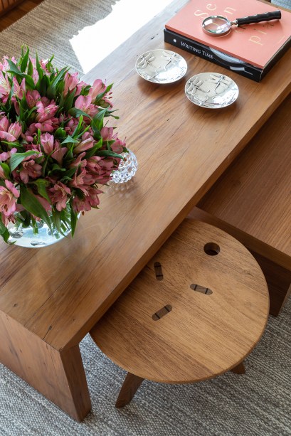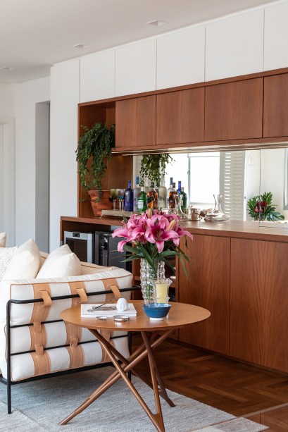 Para solucionar o desafio de armazenamento, a arquiteta montou uma marcenaria que entrou no visual da sala. “Conseguimos colocar os itens em um armário sem ser careta, todo ‘fechadinho’, e que servisse também como aparador para sala de jantar”, conta.