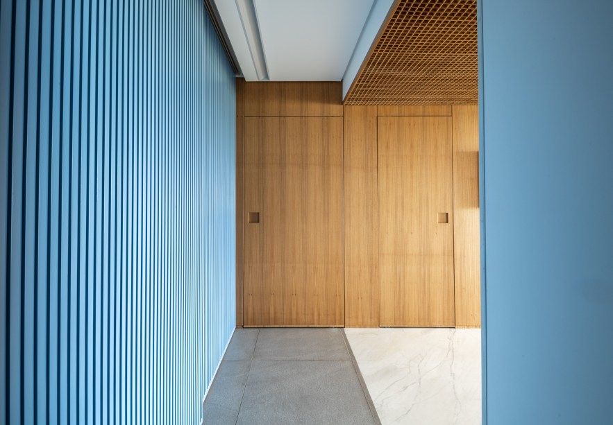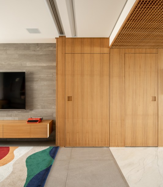 O espaço deste apartamento de 278 m² já era iluminado naturalmente e o projeto assinado por Cristiane Furlan reforça a ideia de céu aberto através de forros de painéis muxarabi iluminados que se repetem no hall de entrada e na circulação, trazendo uma sensação de leveza e de luz natural.