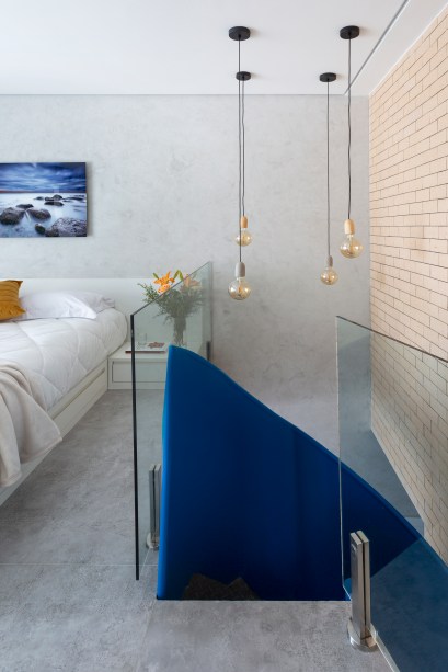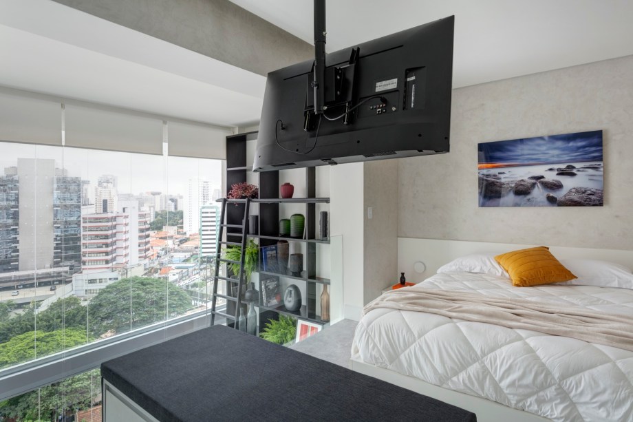 No quarto do casal, que fica no mezanino, além do skyline de São Paulo que entra pelas janelas, há alguns truques que fizeram o espaço parecer maior. Entre eles, um armário em L com portas espelhada. A TV foi instalada em um suporte preso no teto e a cama ganhou gavetas na lateral. “Além disso, coloquei um guarda-corpo de vidro fixado na laje”, finaliza o arquiteto.
