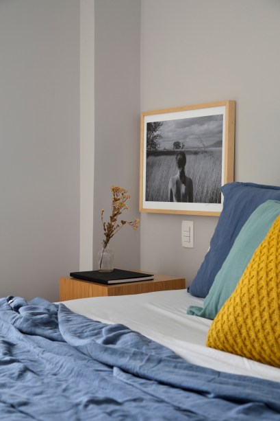 Também eliminamos o quarto de serviço para criar um segundo banheiro que não existia no imóvel, transformando um dos quartos em suíte. Já os quartos originais sofreram alterações pontuais para aumentar áreas de armário e home office, demandas que foram incorporadas ao novo morar”, conta o arquiteto.
