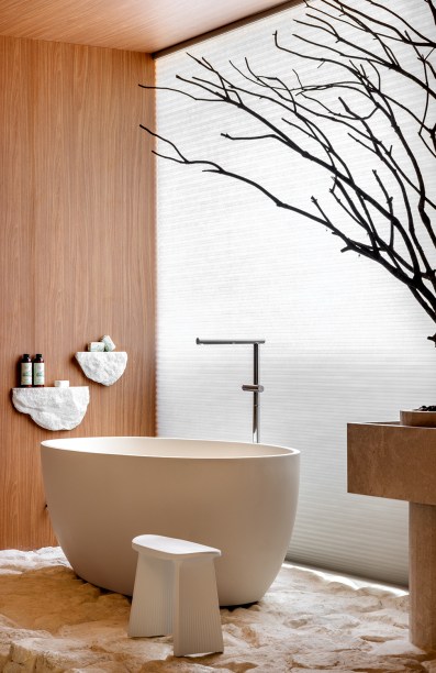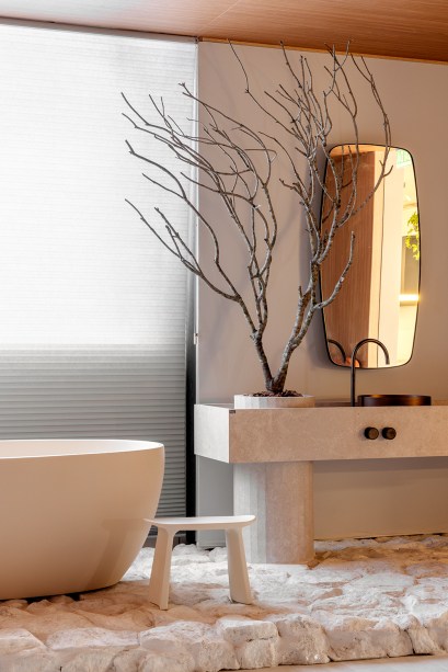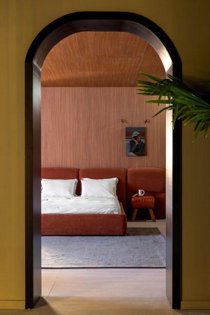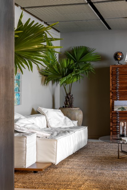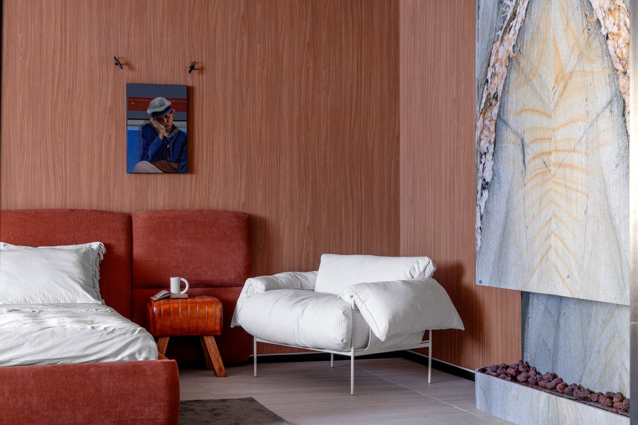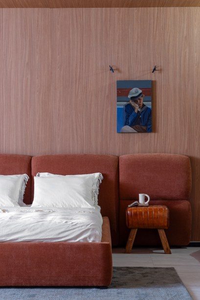A cama e dois sofás foram criados pelo escritório especialmente para a mostra. “Montamos uma linha com peças atemporais pensadas para proporcionar o máximo de comodidade e aconchego ao lar e que acolhesse o corpo, mente e o coração”, explica a arquiteta.