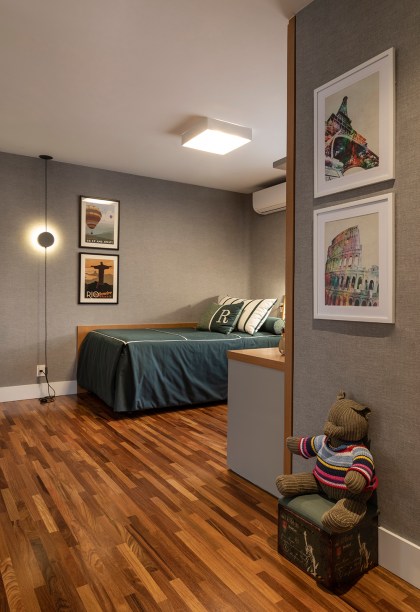 Na sequência do andar estão situados as suítes dos dois adolescentes. O freijó forma a marcenaria do painel da televisão, a escrivaninha para as atividades escolares e a continuidade que formam os dois nichos para expor a coleção de brinquedos e a cabeceira.