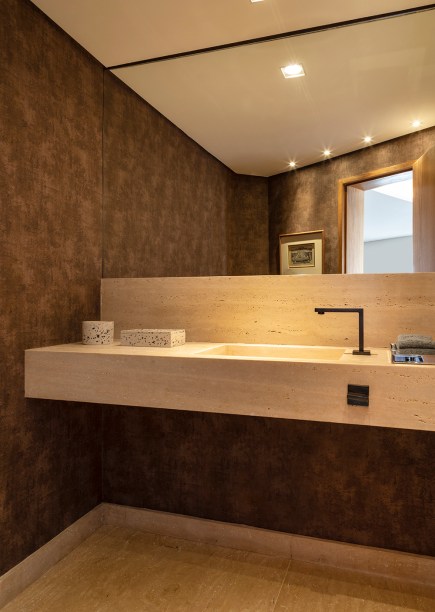 A TV foi pendurada diretamente no material e os equipamentos introduzidos nos nichos abertos pelas profissionais. “Fizemos o que é conhecido como junta seca, que agregou mais homogeneidade e refinamento ao espaço. O revestimento se estende por toda a parede, onde ainda consideramos um lavabo”, descreve Camila.