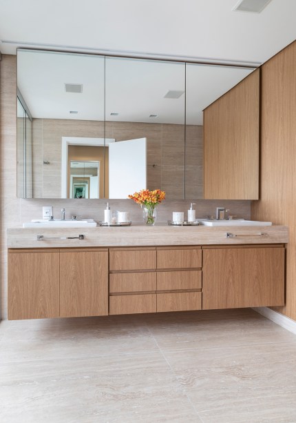 No hall de entrada, por exemplo, o freijó nas paredes promove um aconchegante boas-vindas e as portas mimetizadas no painel colaboram para o visual clean adotado pelas profissionais. Discreta, a porta de entrada foi produzida em modelo pivotante e fica logo ao lado da outra que, de modo imperceptível, conduz à suíte máster.
