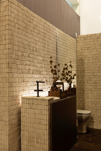 Em contraponto, o arquiteto escolheu a suavidade da laca acetinada numa tonalidade bege acinzentada para destacar alguns pontos importantes do projeto, tanto no mobiliário da cozinha, que conta ainda com uma ilha e uma bancada em Xtone, como também no closet, com uma proposta aberta e nichos com uma iluminação que destaca o fundo e valoriza o revestimento cerâmico rústico.