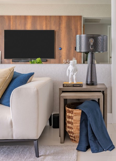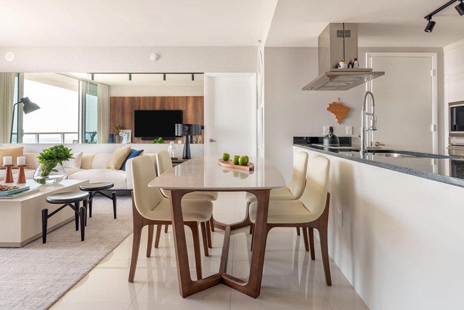 O projeto de interiores é da arquiteta Nayara Macedo, que pensou em uma paleta neutra, de tons claros, e uma cozinha integrada ao living, já que o hobbie favorito do morador é cozinhar, preparar drinques e receber os amigos em casa. Também por isso, ele também pediu uma sala versátil que pudesse acomodar mais pessoas em dias de casa cheia.