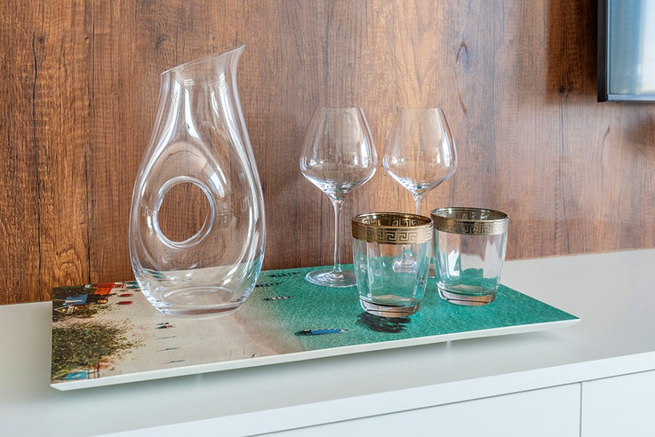 “O ponto de partida foi criar um layout que priorizasse a vista do mar, evitando obstáculos. A grande faixa de espelho estrategicamente colocada na parede atrás do sofá, por exemplo, reflete o mar, o céu e seus variados tons de verde e azul dentro da sala”, diz a arquiteta.