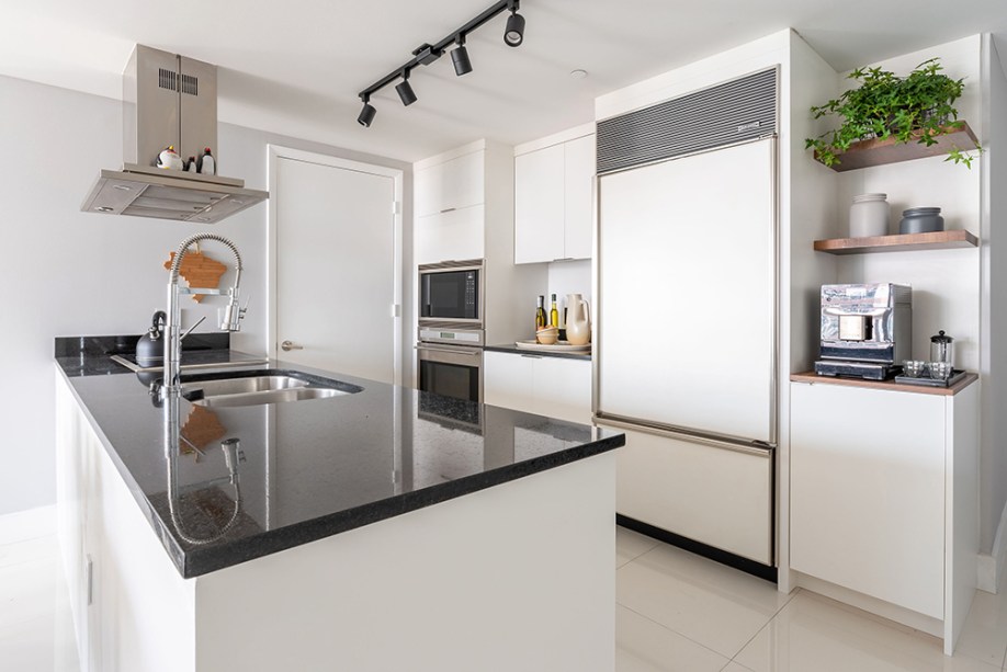 Bancada de lâmina sintetizada integra cozinha e área gourmet neste apartamento