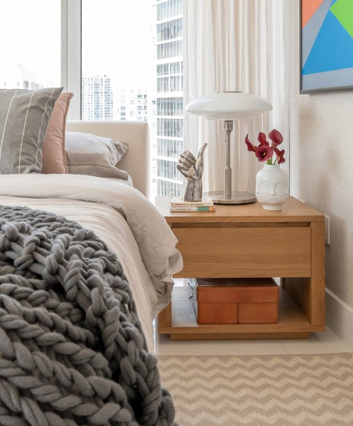 A outra demanda era posicionar a cama de sua suíte com a cabeceira voltada para a fachada de vidro, para que ele pudesse ter a vista do mar quando acordasse e não da cidade.